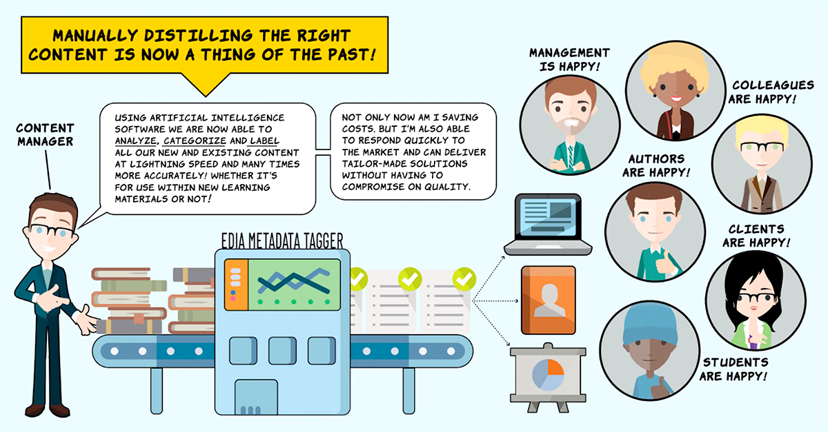 Avallain and EDIA will work together by integrating EDIA’s Smart Content capabilities into Avallain’s online authoring tool Avallain Author and learning platform architecture Avallain Unity. EDIA applies natural language processing (NLP), a form of Artificial Intelligence, to create metadata. Its technology analyses educational texts in order to determine readability levels on the CEFR framework, extract keywords and classify topics in a taxonomy. EDIA’s capabilities will further enhance Avallain’s powerful tools and offer educational publishers easy access to metadata automation. These services can be applied both in the process of content creation in Avallain Author, where authors and editors get better tools to add metadata, and in the learning content management in Avallain Unity, where automated tagging can be used to tag and analyze existing content portfolio.