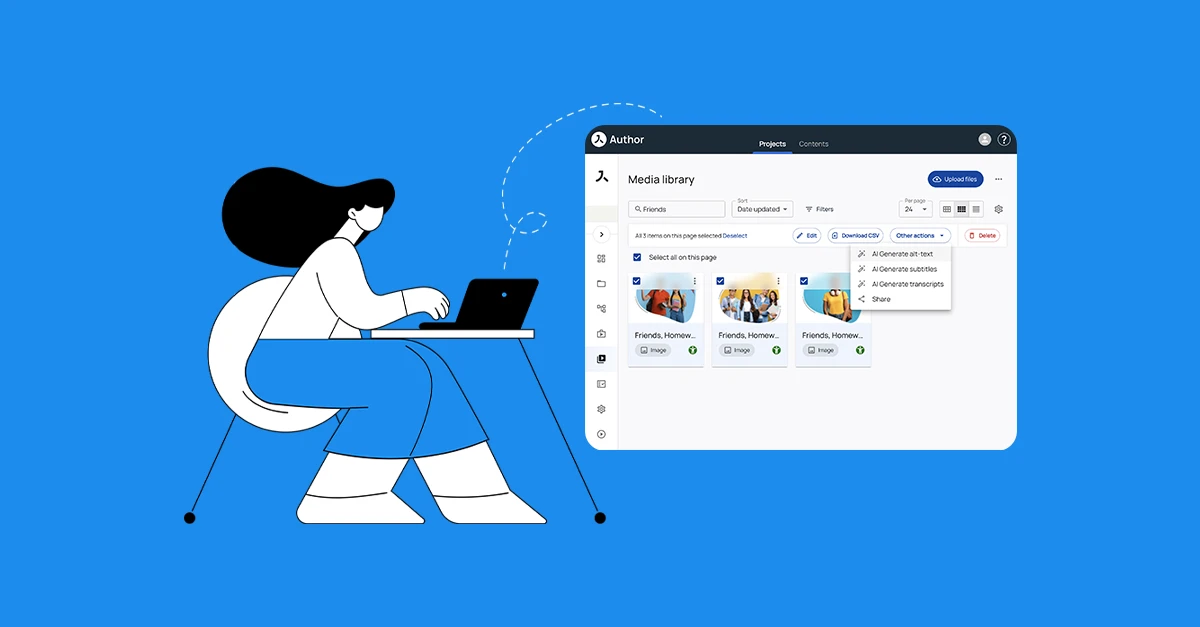 Once automatic metadata generation has been enabled, AI will be used to generate the alternative text for images, subtitles for videos and transcripts for audios and videos upon upload into the media library. In addition to automatically generating metadata when uploading assets, you can select one or more existing assets in the media library and use the new Other actions menu to bulk generate metadata using AI.
